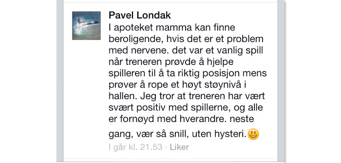 Bodø/Glimts Pavel Londak var ikke nådig med fotballmamma Synne Høyforsslett Bjørbæk på Facebook etter reaksjoner under forrige helgs turnering i Nordlandshallen. Han anbefalte nervemedisin og ba om mindre hysteri.